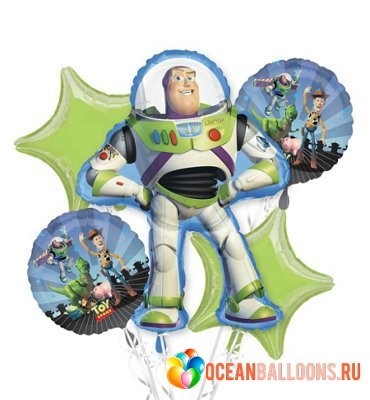 Букет "Истории игрушек", состоит из 2 круглых фольгированных шаров, большой фольгированной фигуры и 2 фольгированных звезд. Шары в виде Вуди и Базза Лайтера подарят счастье и радость Вашему ребенку!