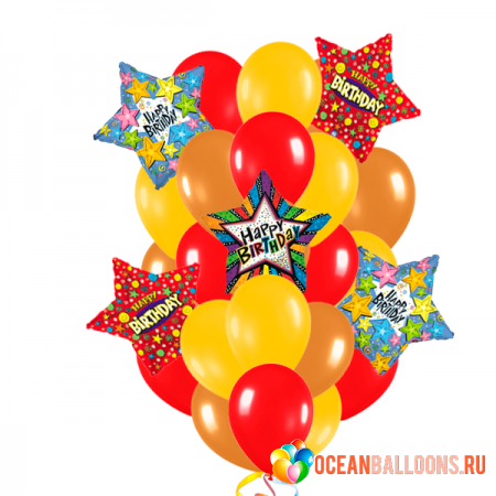 Композиция из 10 красных и желтых латексных шаров и 5 фольгированных звезд с принтом "С Днем рождения". Очень классный и необычный подарок на День Рождения! OCEAN BALLOONS РЕКОМЕНДУЕТ!