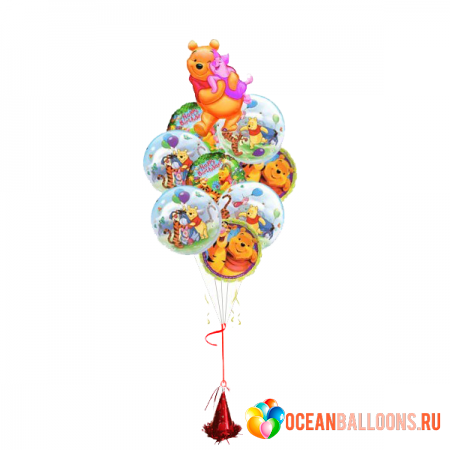 Букет "Поздравление от Винни", состоящий из 8 фольгированных шаров-кругов с поздравлениями и большой фольгированной фигуры, сделает Ваш праздник запоминающимся!