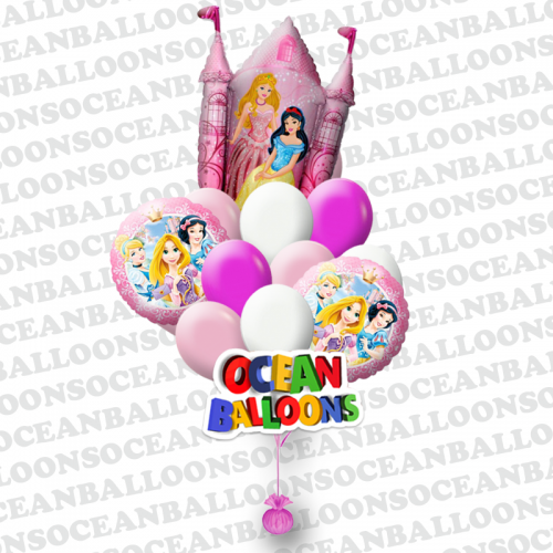 Букет "Юной принцессе" из 18 белых и розовых латексных шариков и 2 фольгированных шаров с принтом в виде принцессы и 1 фольгированной фигуры-замка.