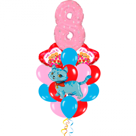 Букет "Женский День", состоящий из 10 латексных воздушных шаров, 2 фольгированных сердец, фольгированной фигуры кошечки и большой фольгированной цифры(при желании, цифру можно изменить). Данная композиция из воздушных шаров станет великолепным подарком на праздник 8 марта! Букет из воздушных шаров будет замечательным проявлением внимания, Ваш любимый человек будет счастлив!