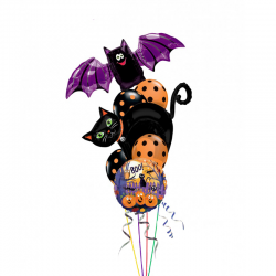 Композиция «Хеллоунский кот и мышка» из 15 латексных воздушных шаров, 1 фольгированного круга, 1 фольгированной фигуры кота и 1 летучей мышки станет запоминающимся подарком на хеллоуин и принесет много положительных эмоций в такой хороший день.