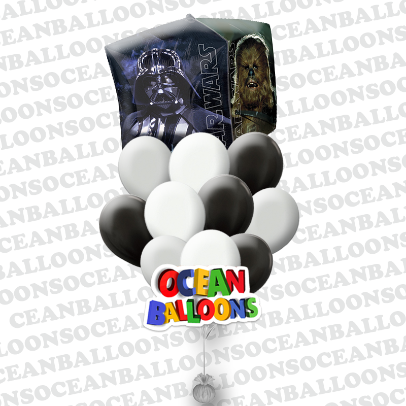 Набор воздушных шаров «Звездные войны» станет прекрасным подарком для каждого любителя этой культовой киновселенной. Набор включает в себя воздушные шарики сдержанных тонов 15 штук, а также крупный шар-куб с большими изображениями героев фильма.