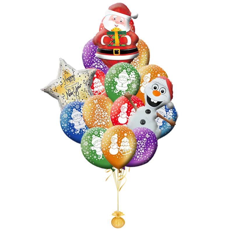 Воздушные композиция из шариков на Новый год «Поздравление от Санты и Олафа» состоящий из 1 фольгированной звезды, 1 воздушной фигуры Санты, 1 воздушной фигуры Олафа и 10 разноцветных воздушных латексных шаров Снежинок станет запоминающимся подарком для ваших близких и приятным украшением вашего Новогоднего праздника.