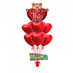 Букет «Признание Мишки» состоящий из 8 фольгированных сердец и одной большой фигуры мишки с большим сердцем с надписью «Я люблю тебя! Это много.» приятно удивит, создаст прекрасное настроение, подарит много любви и море положительных эмоции.