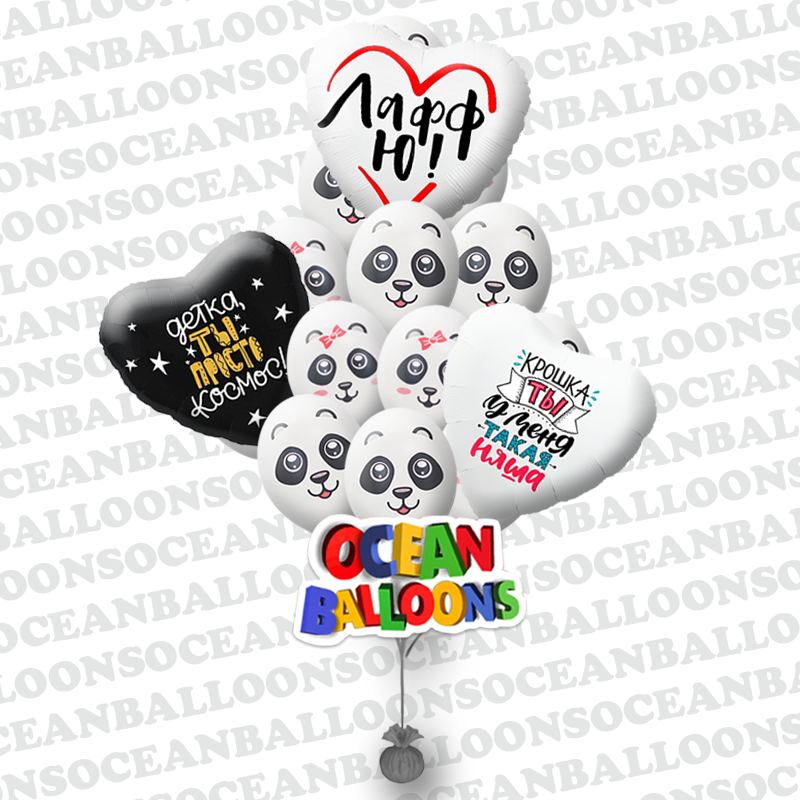 Композиция признание в чувствах от панды это оригинальный способ признаться в своих чувствах второй половинке, композиция состоит из 15 латексных шаров и 3 фольгированных сердец.