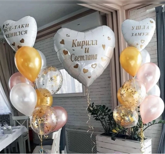 Свадебный букет состоит из 15 латексных воздушных шаров, а так-же 3 фольгированных шаров-сердец с надписью. Данная композиция станет очень прекрасным украшением свадьбы, его появление в зале подарит невероятную атмосферу праздника!