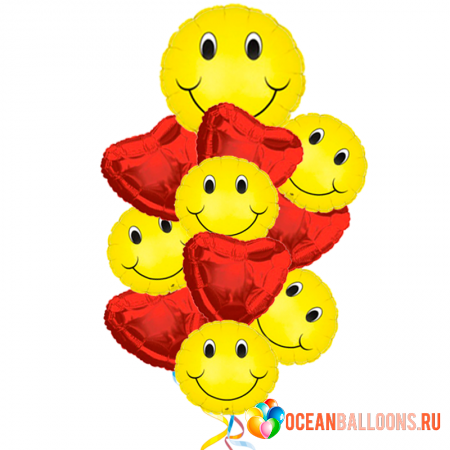 Композиция "Небосклон Смайлов", состоящая из 5 фольгированных сердец, 5 фольгированных смайлов и одного огромного фольгированного шара-смайла, будет великолепным подарком Вашему близкому человеку!