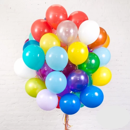Огромное облако из 60 цветных латексных шаров, достаточное для украшения потолка просторного офисного помещения или большой жилой комнаты.